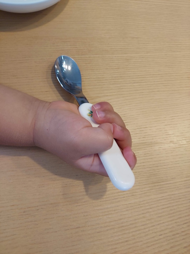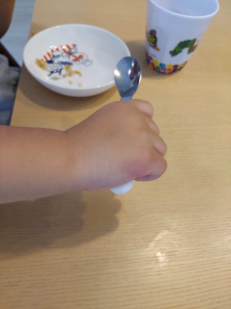 スプーンを手のひら全体で握った上手持ちは、どの子も一番最初に通る持ち方です。